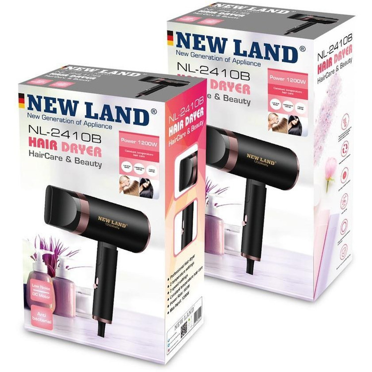 سشوار نیولند مدل NL-24108B یک سشوار مسافرتی با توان 1200 وات است. این سشوار دارای موتور DC و المنت سرامیکی است. همچنین دارای قابلیت تولید باد سرد، فیلتر هوای قابل جدا شدن، کنترل سرعت باد و سه سرعت مختلف است.