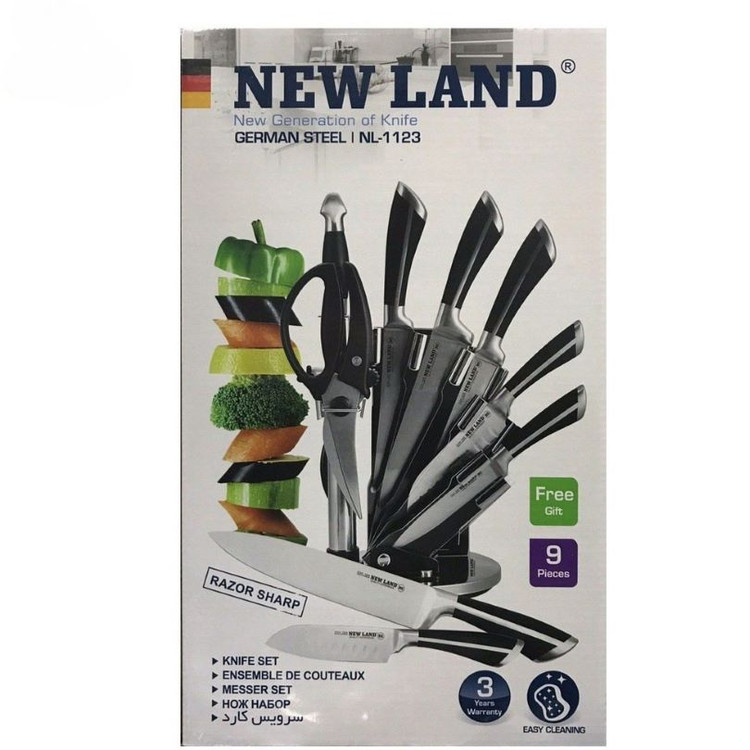 سرویس چاقو هفت پارچه نیولند مدل NL-1123 شامل چاقوهای با کیفیت بالا با تیغههای فولاد ضدزنگ و دستههای ارگونومیک ضد لغزش است. این سرویس برای انواع برشها در آشپزخانه مناسب بوده و طراحی زیبا و مدرنی دارد