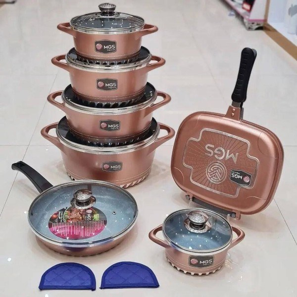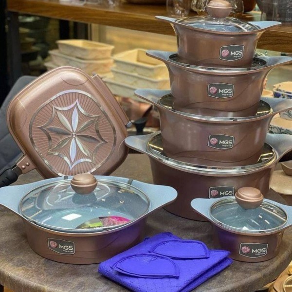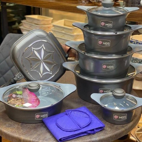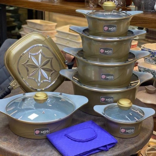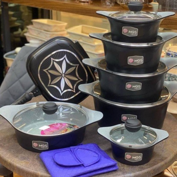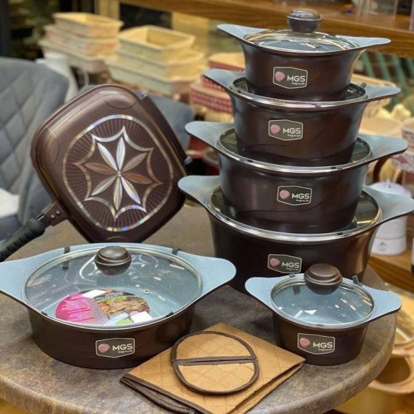 برند MGS جنس بدنه آلومینیوم طول 56CM عرض 53CM ارتفاع 44CM تعداد پارچه 17 جنس در پیرکس جنس روکش گرانیت طول عمر 12 سال قابل استفاده داخل فر گارانتی 18 ماه مقاومت در برابر حرارت تا 260 درجه سانتیگراد